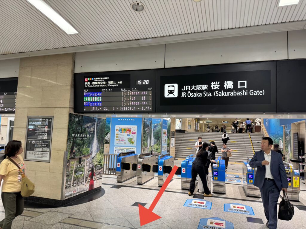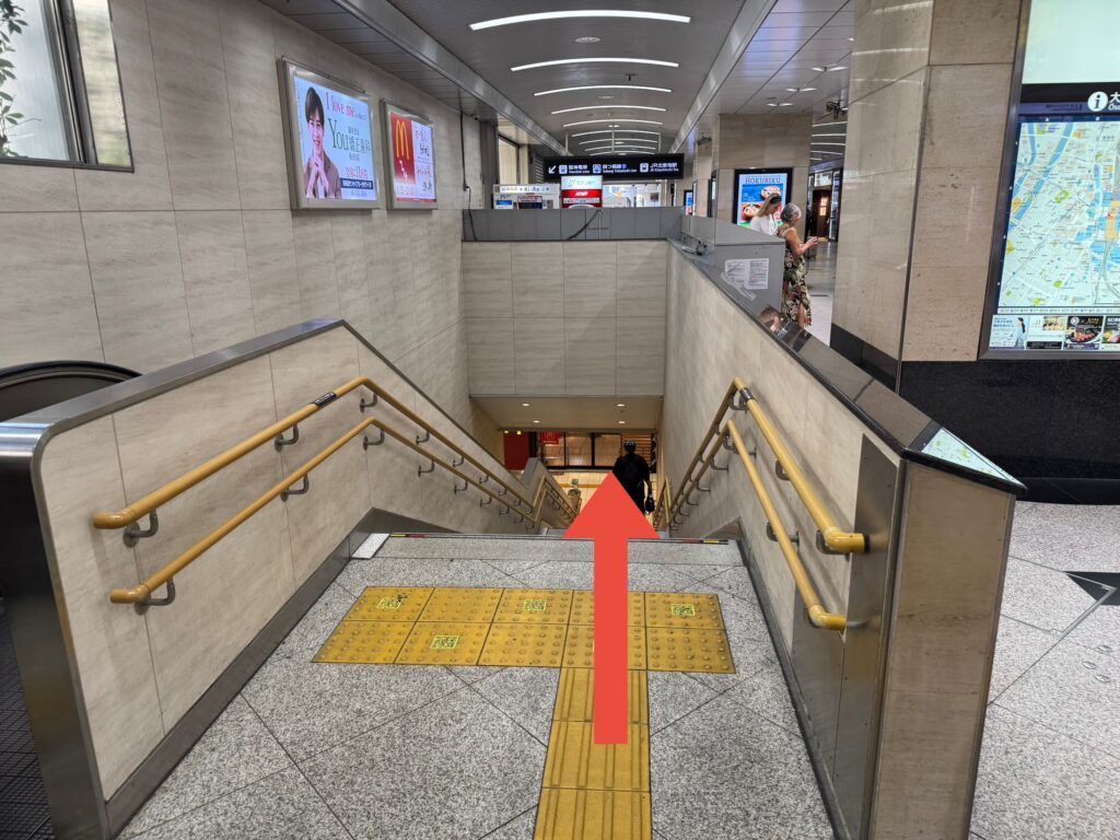 ①1階にあるどの改札からも行けますが、一番距離が近い「桜橋口改札」からの案内をします。出て目の前の階段に向かいます。