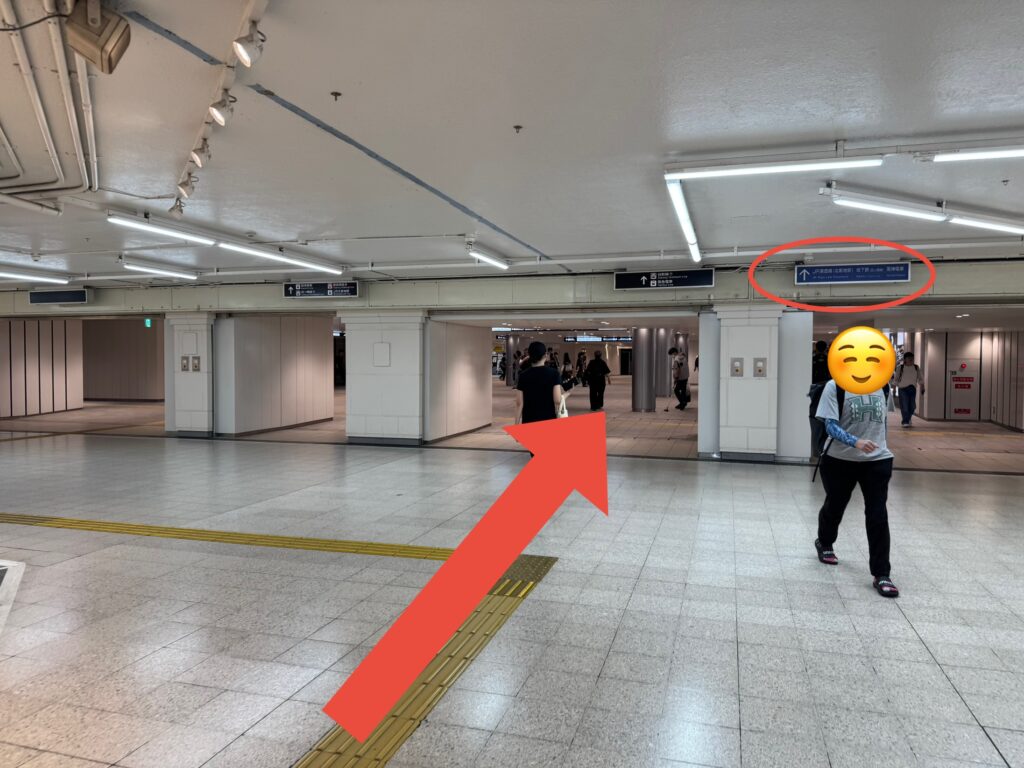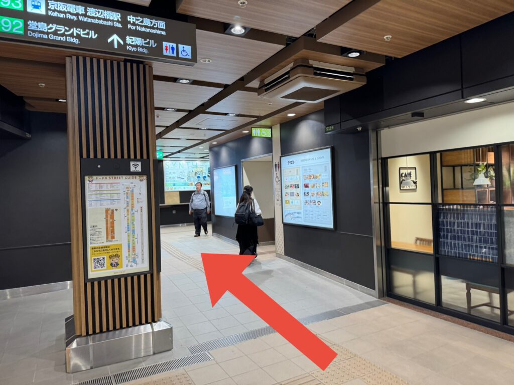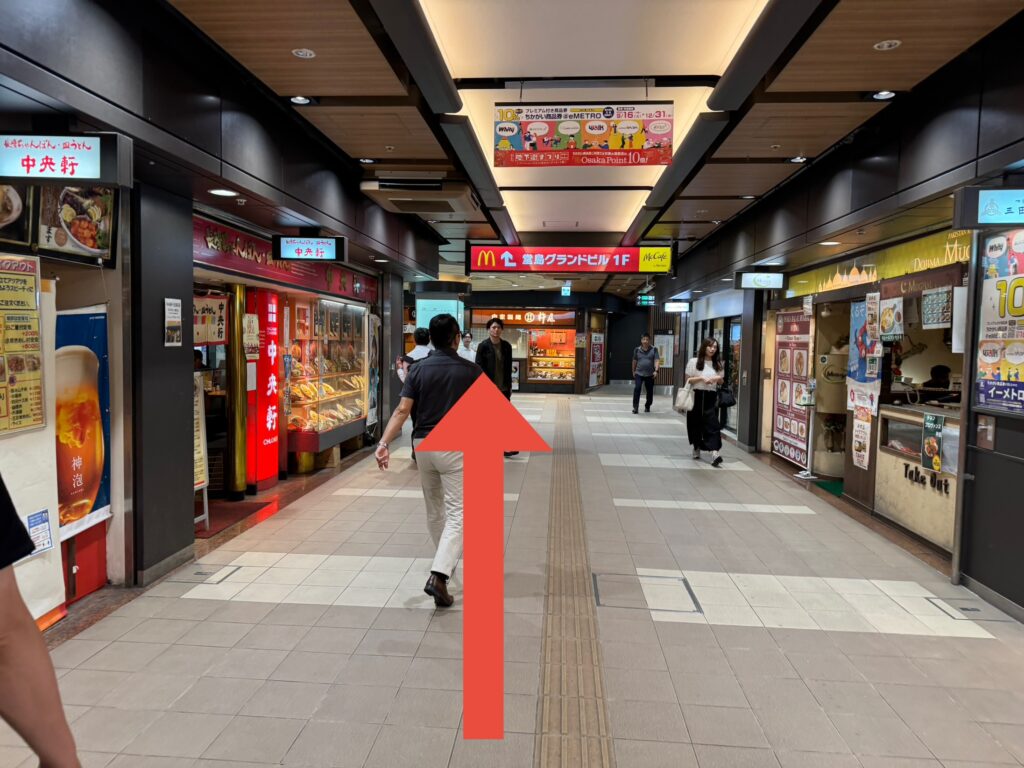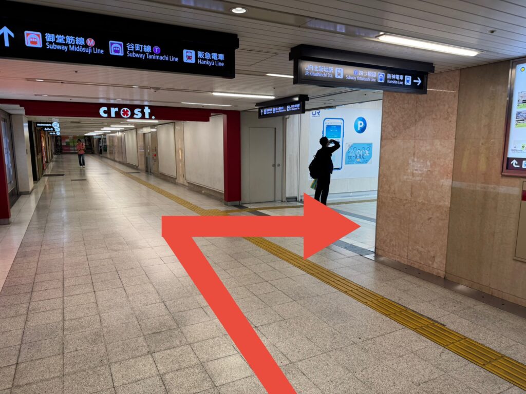 更にまっすぐ進んでいきます。案内板に「JP北新地駅」とありますので、目印にしてください。