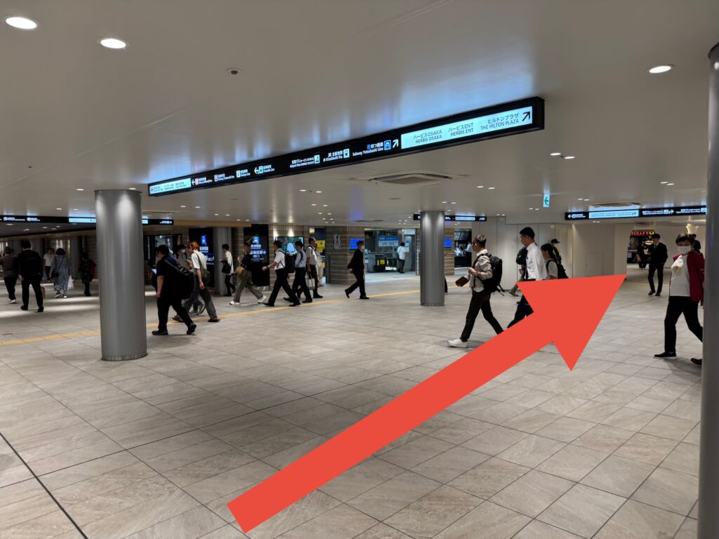 広いコンコースの左右と前方にいくつか通路が見えますが、前方右方向に少し歩くと「地下鉄四つ橋線の西梅田駅」の改札が見えてきます。 (床と天井などに、案内表示があるので四つ橋線を目印に進んで行きます。)