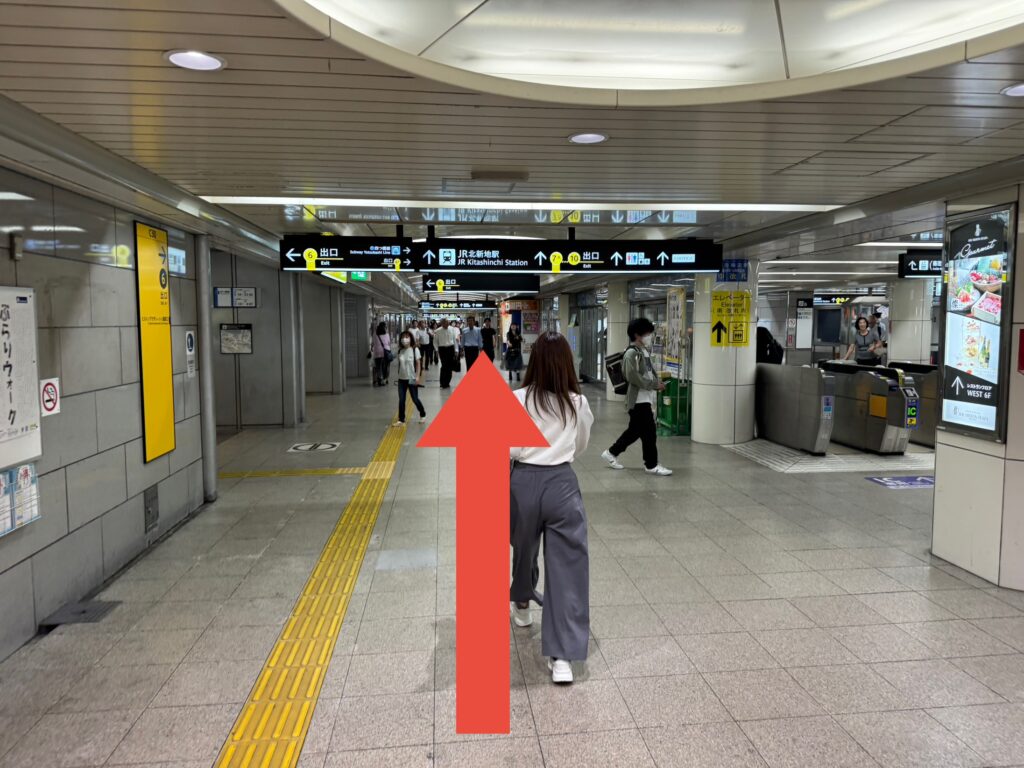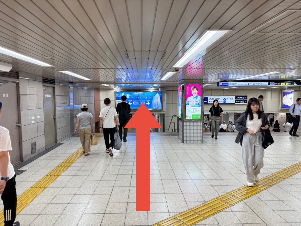 西梅田駅に並行して階段を降りて、左の通路を進んで行きます。(西梅田駅を挟んで両側に通路があり、右側からはエスカレーターがあります。)