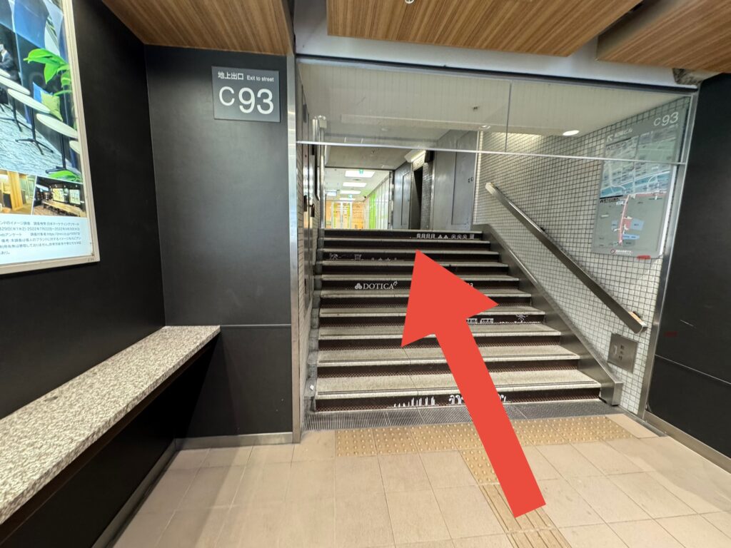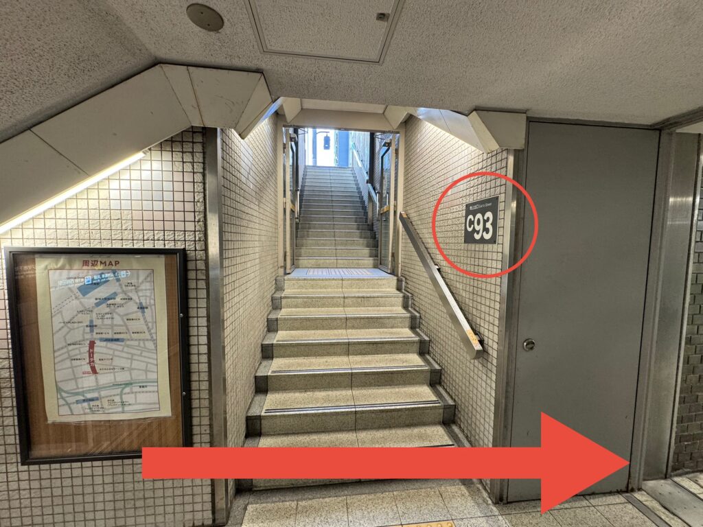 ⑥左手にc93の階段があります。こちらから上がっても行けますが、エレベーターを使う方はこのまま通り過ぎます。