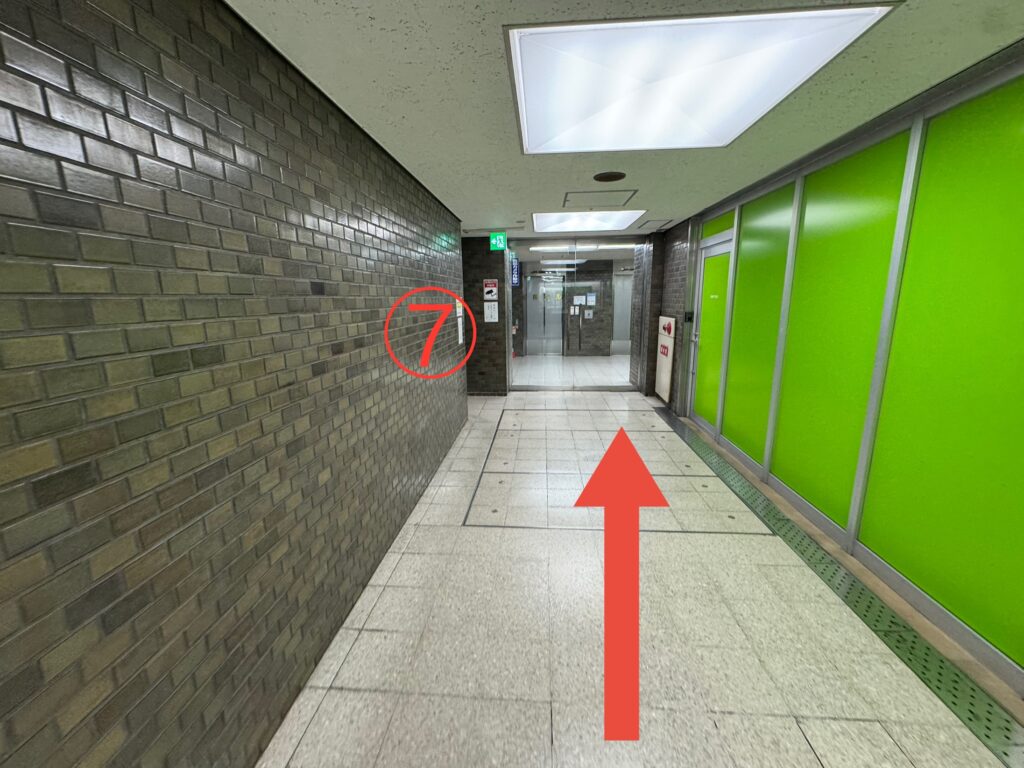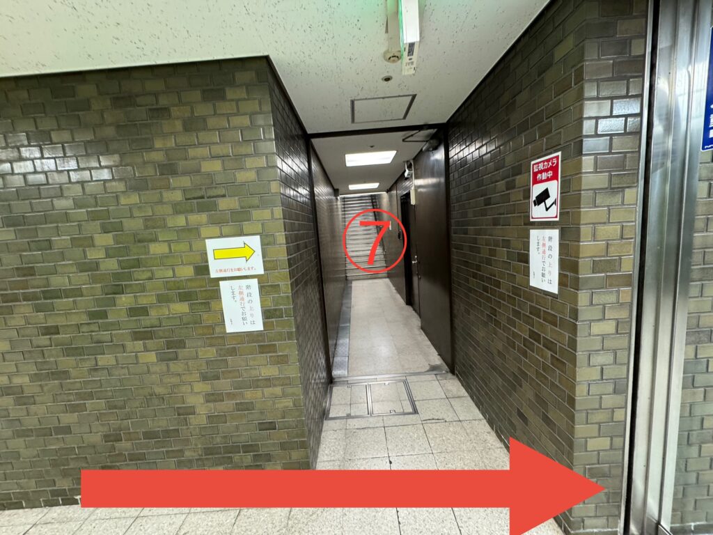 ⑦の階段を曲がっても上がれます。エレベーターを使う場合は直進します。